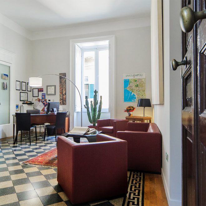 La stanza da letto principale di questa antica residenza nobiliare colpisce per la particolarità del balcone, del suo sistema di oscuramento e per gli arredi in legno di radica di noce che rendono ancor più affascinante il soggiorno di chi sceglie questa soluzione.